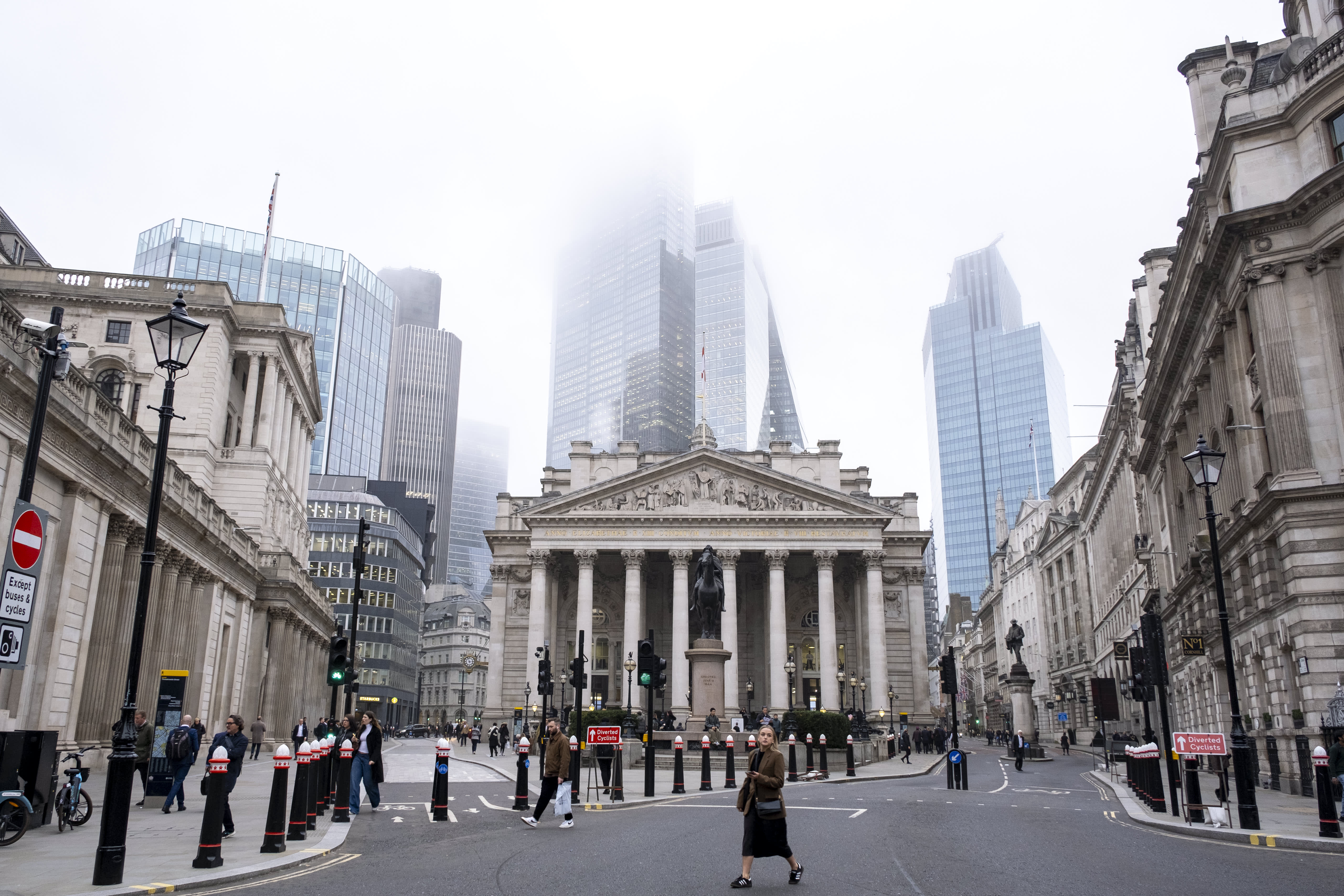 View looking towards the Royal Exchange and in the City of London where the glass architecture of the tower 22 Bishopsgate disappears into mist on 6th November 2024 in London, United Kingdom.