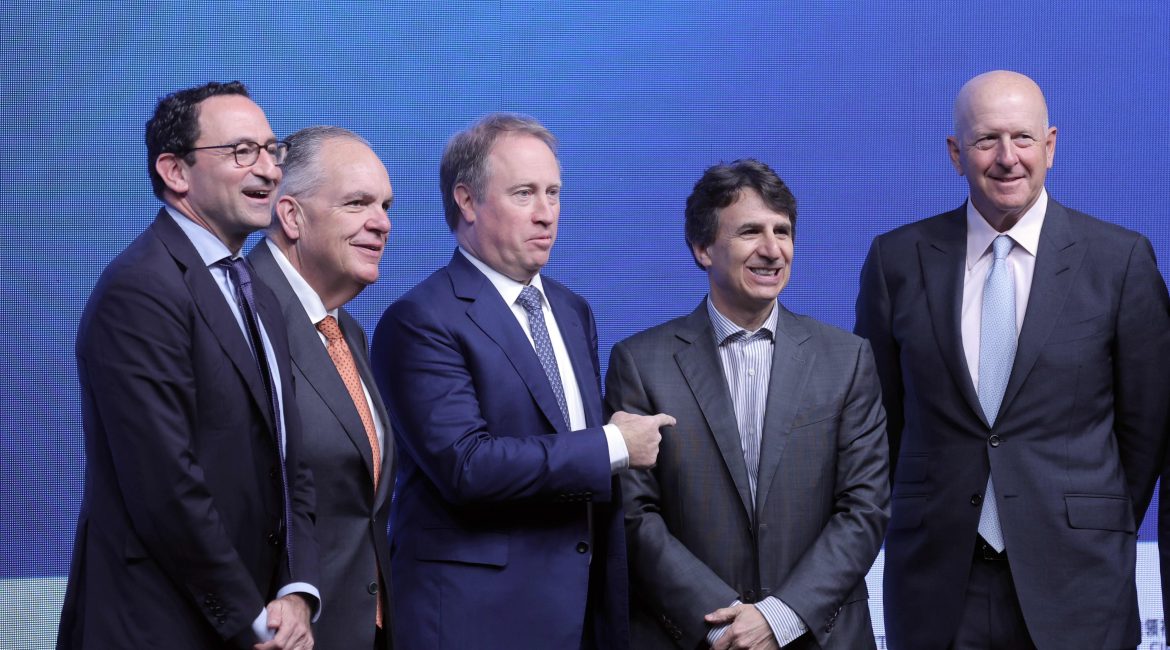Jonathan Gray, president and chief operating officer of Blackstone Inc., from left, Ron O'Hanley, chief executive officer of State Street Corp., Ted Pick, chief executive officer of Morgan Stanley, Marc Rowan, chief executive officer of Apollo Global Management LLC, and David Solomon, chief executive officer of Goldman Sachs Group...