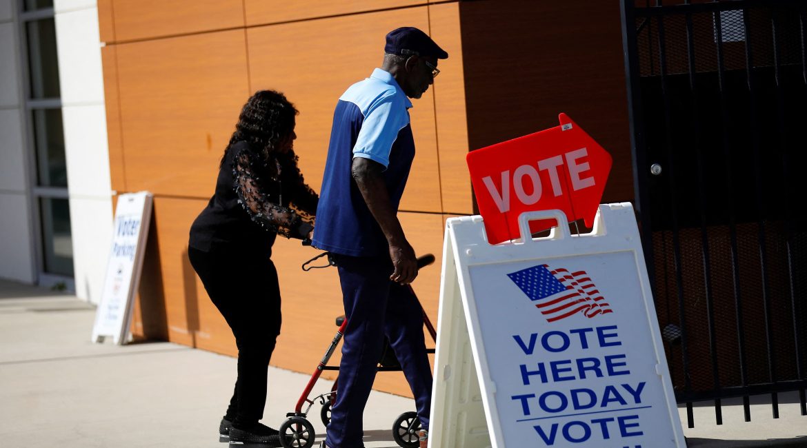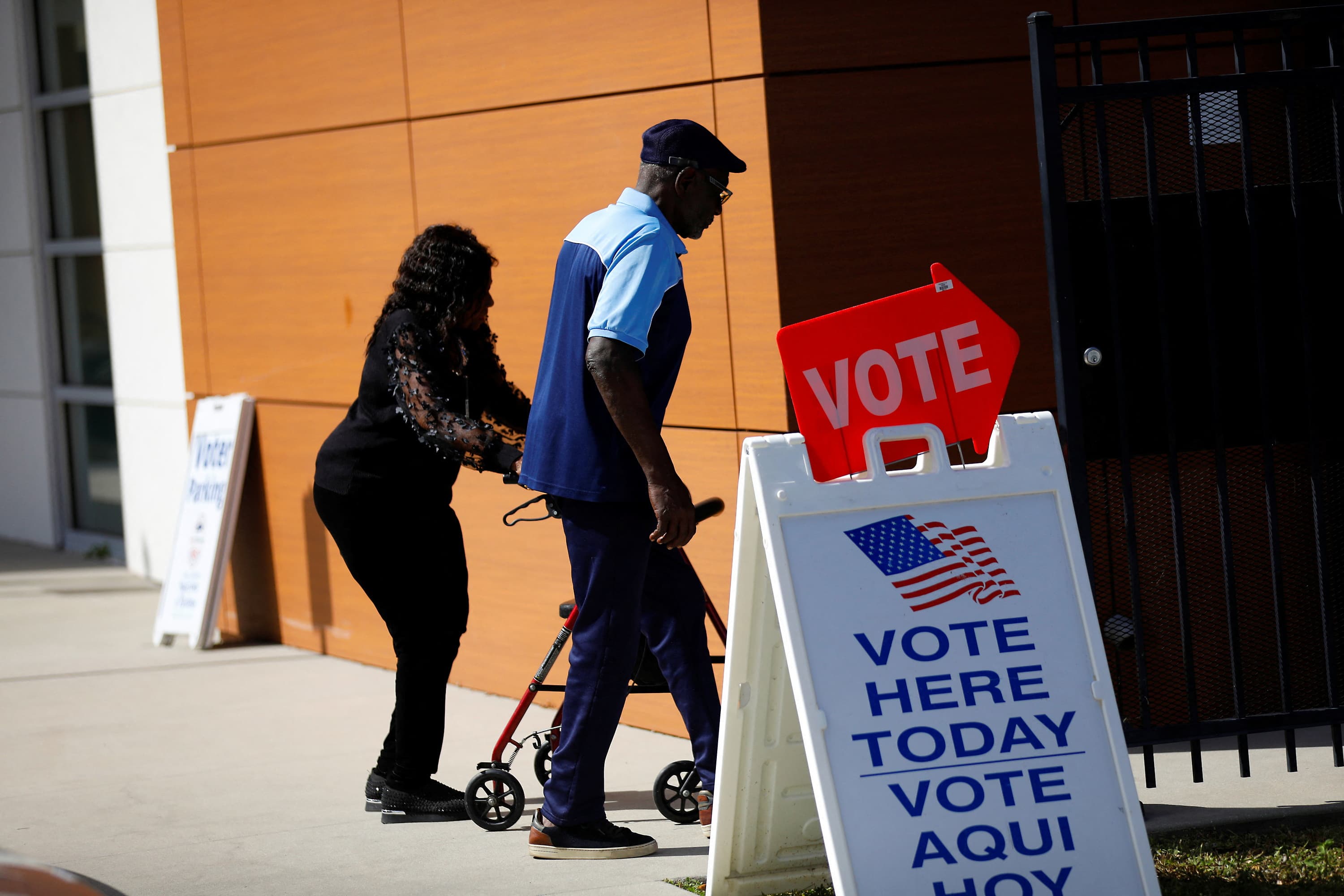 Voters walk to cast their ballots during early voting in the presidential election at a polling station at the C. Blythe Andrews, Jr. Public Library in Tampa, Florida, U.S., November 1, 2024.