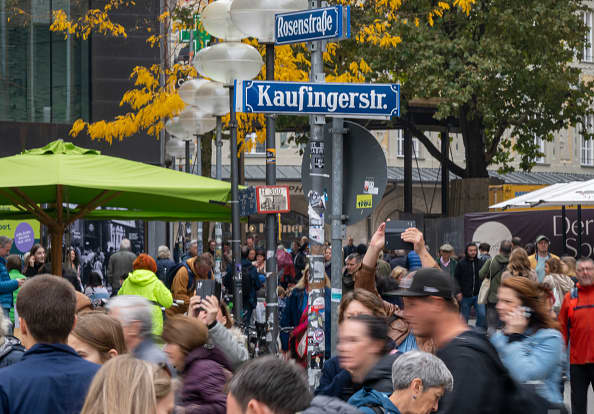 Passers-by walk in the pedestrian zone of the Bavarian capital.