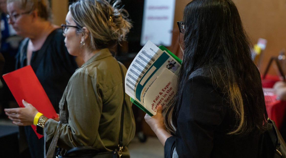A jobseeker holds flyers during the New York Public Library’s annual Bronx Job Fair & Expo at the the Bronx Library Center in the Bronx borough of New York, US, on Friday, Sept. 6, 2024.