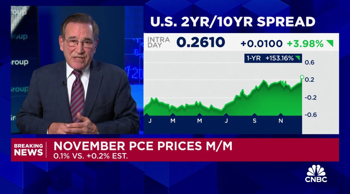 The personal consumption expenditures price index, the Fed’s preferred inflation gauge, showed an increase of just 0.1% from October. The measure indicated a 2.4% inflation rate on an annual basis, still ahead of the Fed’s 2% goal, but lower than the 2.5% estimate from Dow Jones. The monthly reading also was 0.1 percentage point below the forecast.